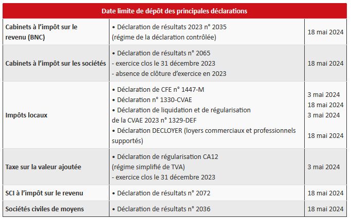 En revanche, les autres déclarations fiscales annuelles des entreprises devront être souscrites pour le 3 mai 2024 (cf. tableau ci-dessous).