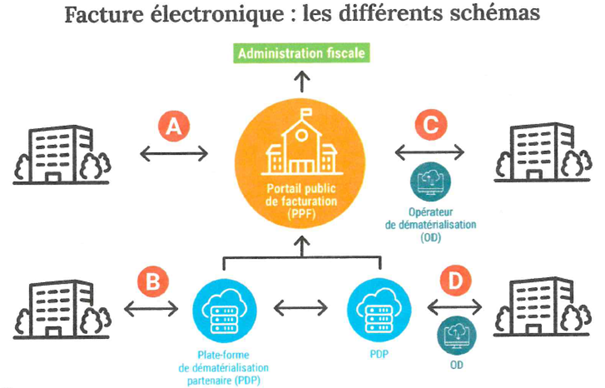 Enfin, vous pouvez opter pour un simple opérateur de dématérialisation (OD) C. Contrairement aux PDP, les OD ne sont pas agréés par l'administration fiscale. Ils ne servent donc que d'interface entre votre entreprise et le portail public de facturation ou une PDP D.