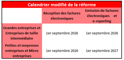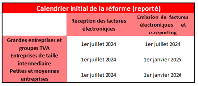 Le 28 juillet dernier, le ministère de l'Économie et des Finances a décidé « de reporter l'entrée en vigueur du dispositif afin de donner le temps nécessaire à la réussite de cette réforme structurante pour l'économie ». Sauf nouveau changement, le nouveau calendrier d’entrée en vigueur vient d’être définie lors des travaux d'adoption de la loi de finances pour 2024, comme suit :